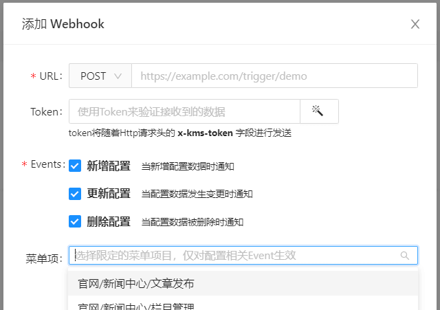 Webhook 的功能仅限定于在 KMS 管理的数据,这些数据在“配置中心”查看和修改。其他形式(比如视图)管理的数据由于不在 KMS 存储,将无法支持 KMS Webhook 功能;