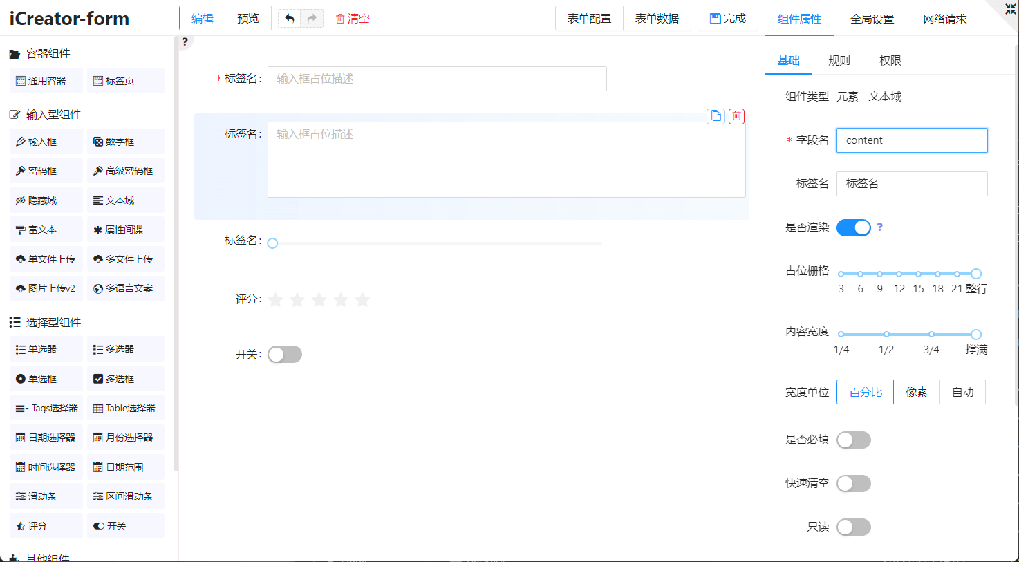 拖拽器是 KMS 核心功能,它可以从预设的组件库中通过拖拽操作,像搭积木一样拼接出表单和视图。拖拽器是一个独立的特殊组件,并且有一个自己的名字:iCreator,它有两种模式:form 和 view,分别对应 表单 和 视图。