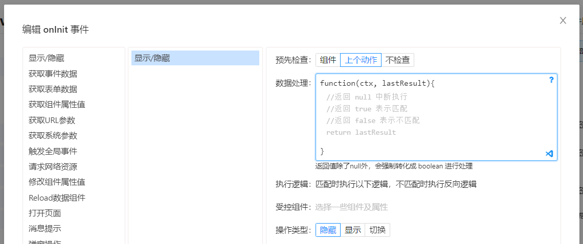 code 选项是 KMS 中特殊的一种配置,需要编写少量 js 代码 来完成 数据格式转化 简单逻辑处理 等功能,这这些功能通常用 UI 界面表单将会异常复杂,甚至无法实现。